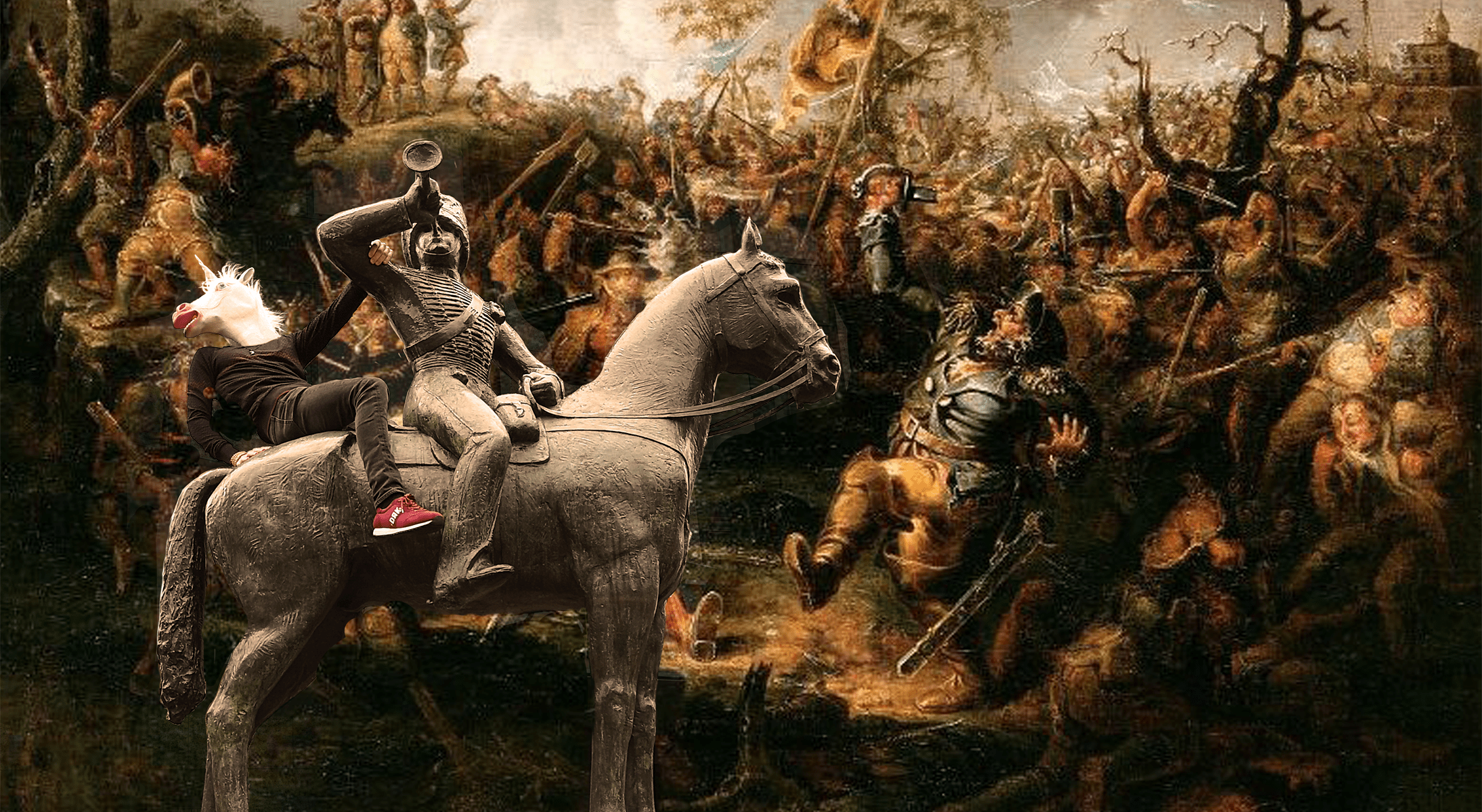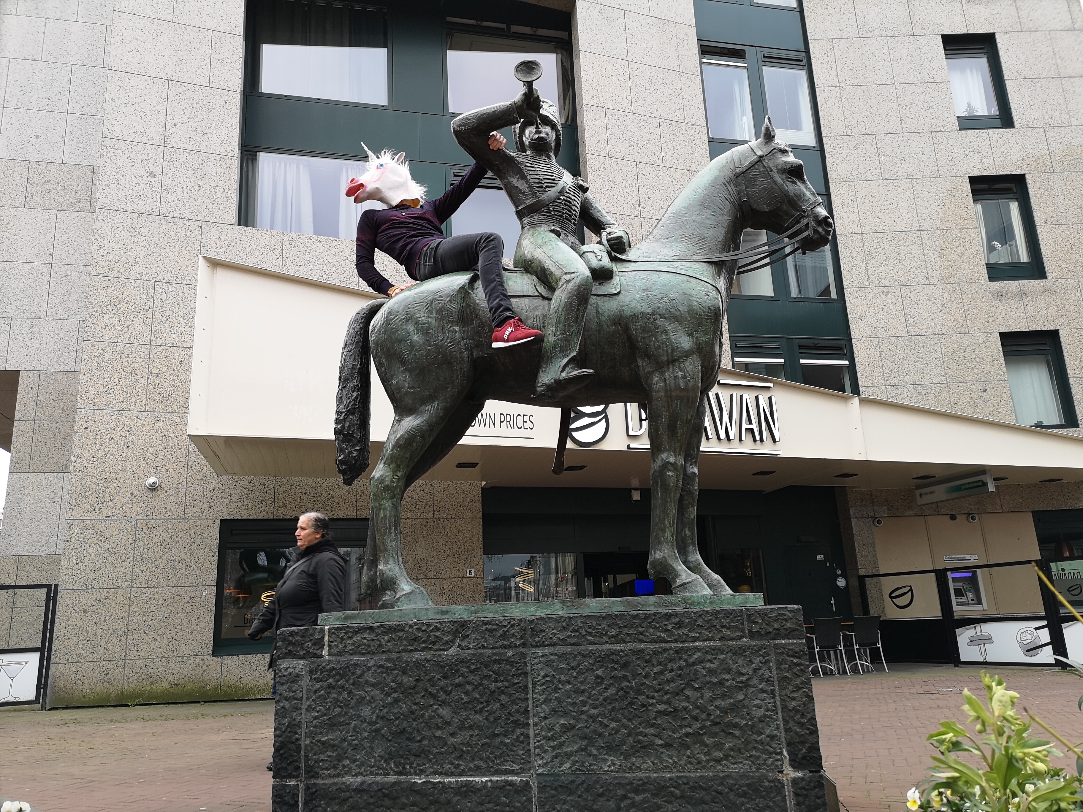 During the walk, we bumped into a statue, which I decided to mount with a secret ingredient: A unicorn mask, pulled out from my bag.