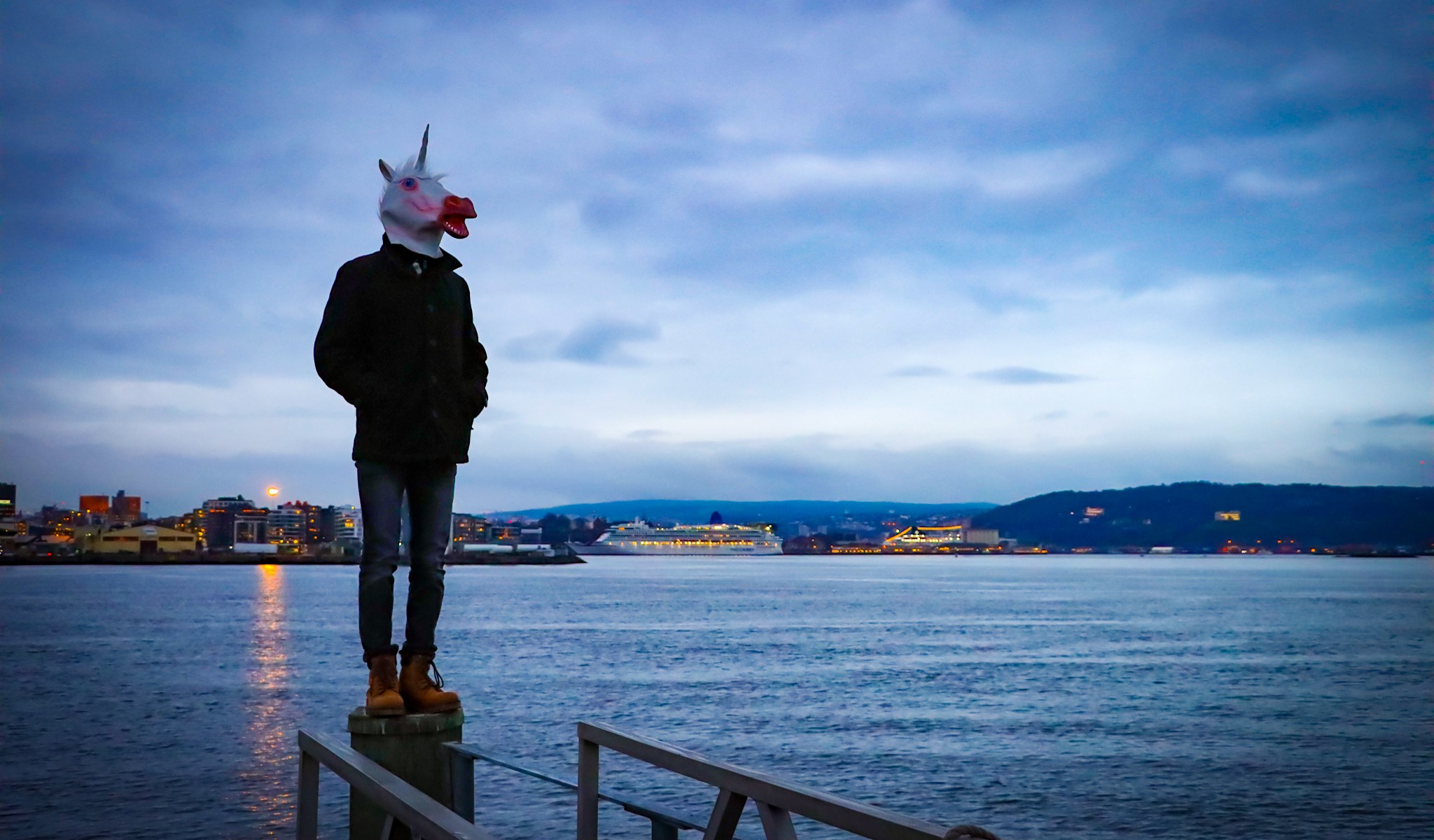 Soon all of our cans were finished; goodbye sobriety. No one gave us “the look” for drinking publicly. That’s one of the many advantages of a progressive country. Hip hip hooray for Norway. When the metro took us closer to the City, we had to rush to the tram. One leg after the other, swiftly but clumsily. We made it without falling. It was time to pull the unicorn mask out and confuse people a bit. A group of girls got up behind our seats, and started talking: