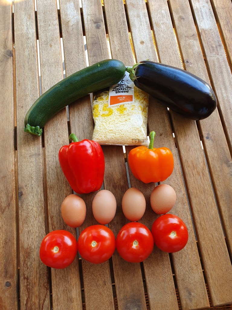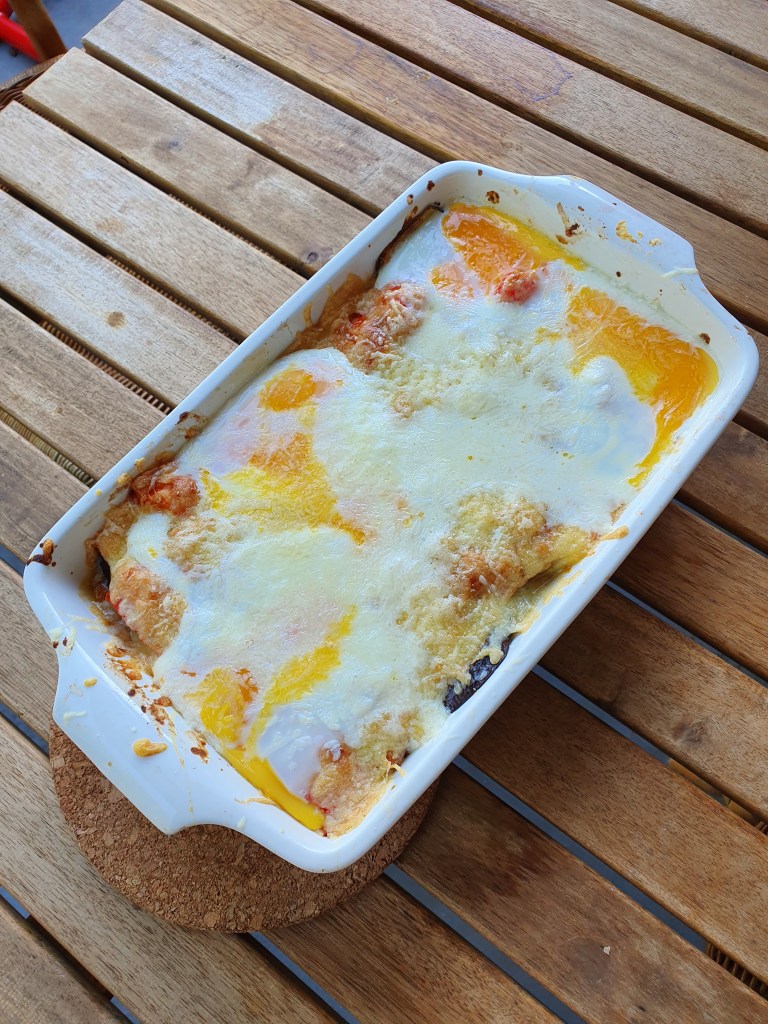 Now a layer of paprika, eggplants, etc. Spread some cheese on it and throw it in the oven.