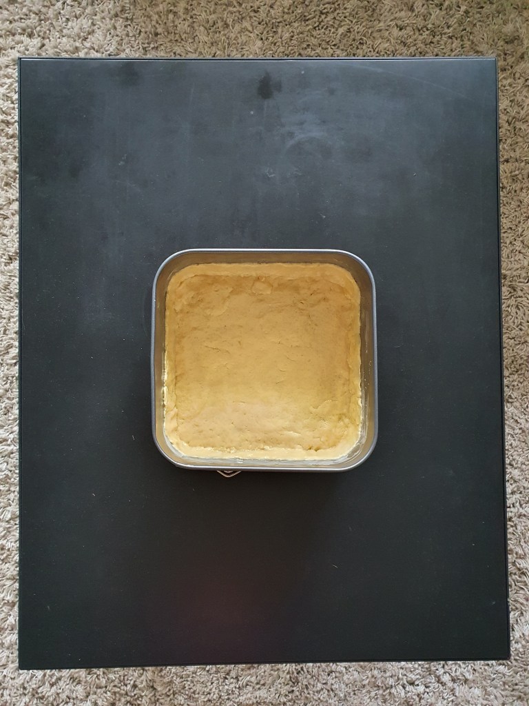 I buttered the bottom of the springform pan, using my fingers like a kid – due to the lack of a cooking brush in our inventory – and tried to evenly spread 2/3 of the dough there.