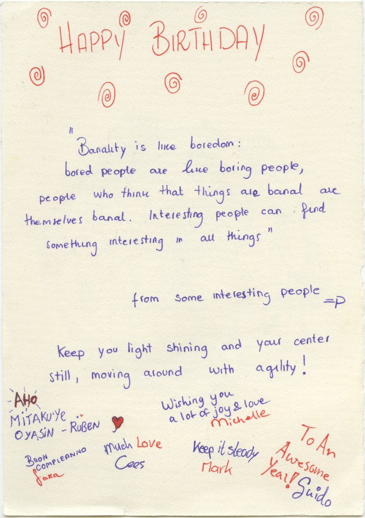 After the round, they handed me my gift – a handmade birthday card signed by everybody, special Arabic coffee, and a book of unwritten poems, where I can collect the messages of everyone who decides to share how it makes them feel when they’re around me.